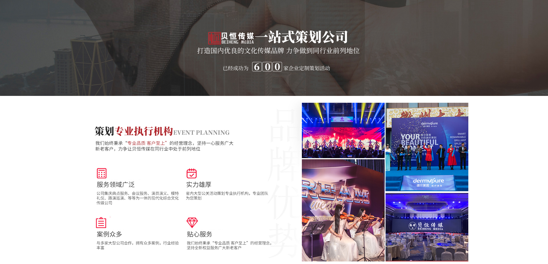 - 合 肥 貝 恒 文 化 傳 媒 專注·專業(yè)·專心·效率 合肥貝恒文化傳媒有限公司2017年成立于安徽·合肥,是省內(nèi)大型公關(guān)活動策劃專業(yè)執(zhí)行機構(gòu),公司集慶典服務(wù)、會議服務(wù)、演員演藝、模特禮儀、路演巡演、展會特裝、廣告制作、設(shè)備租賃、舞美策劃、企業(yè)形象宣傳等為一體的現(xiàn)代化綜合文化傳媒公司,我們始終秉承“專業(yè)品質(zhì)客戶至上”的經(jīng)營理念,堅持全...